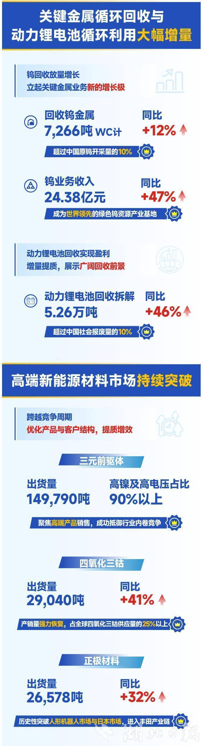 从产销量来看,关键金属镍、钴、钨、锂的提取与回收总量约20万吨,其中印尼镍资源项目镍金属出货超11万吨(含参股产能),同比增长114%;战略金属钴回收量1.5万吨,同比增长约48%。回收钨资源出货量达到7266吨,同比增长12%,销售额同比增长47%,超过中国原钨开采量的10%,成为关键金属提取与回收业务的增长极。动力锂电池回收拆解量5.26万吨,同比增长46%,超过中国社会报废量的10%,动力锂电池回收业务实现盈利。