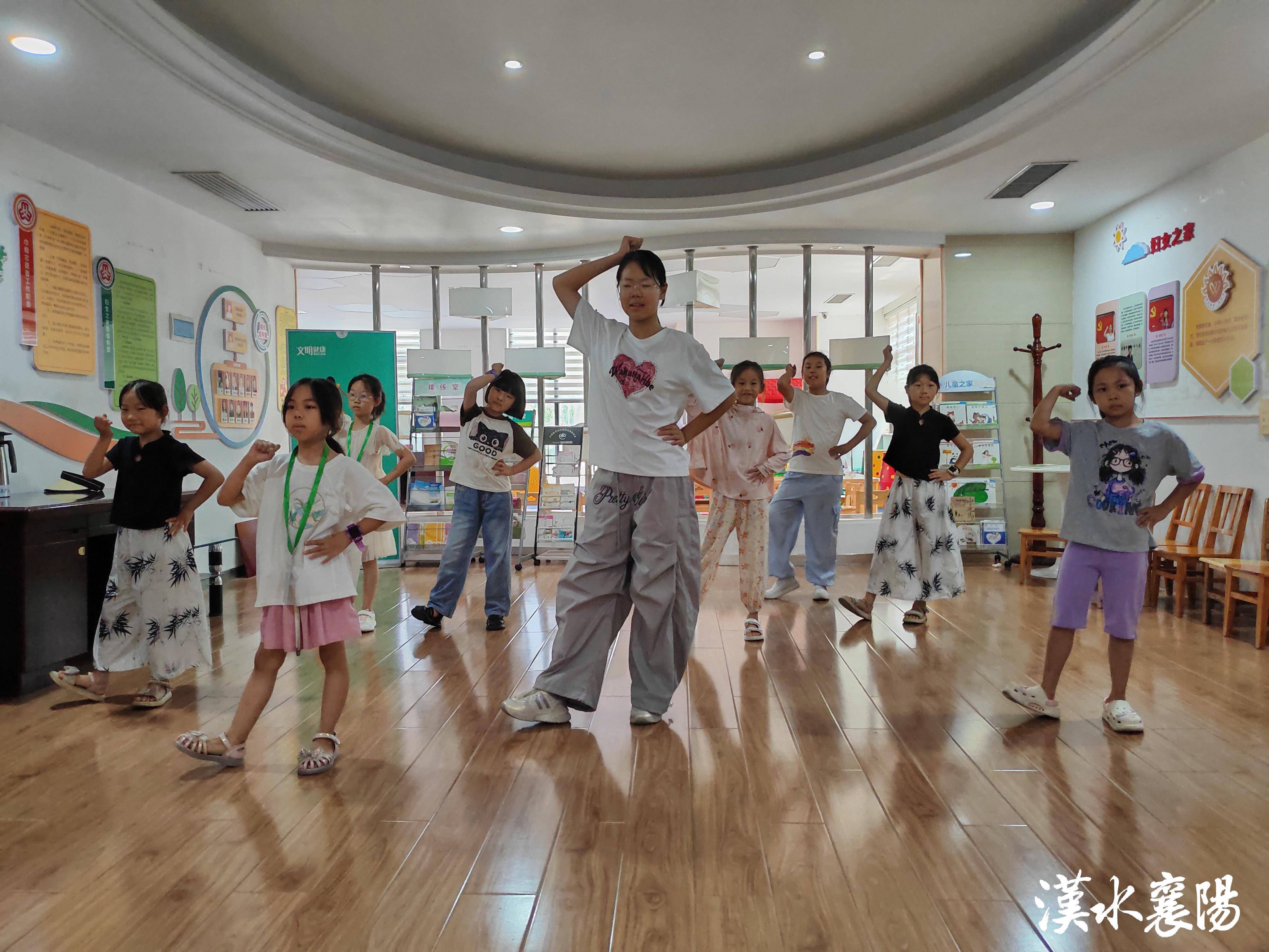 襄城区檀溪湖社区活动室,孩子们跟着志愿者学习跳舞