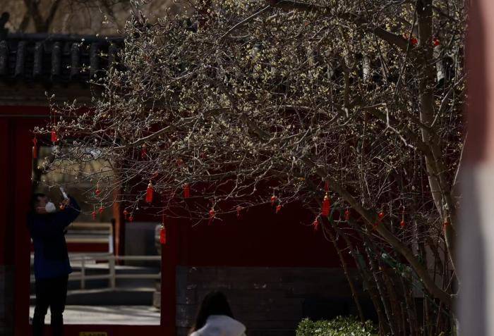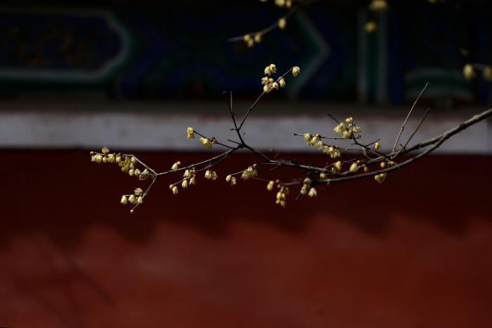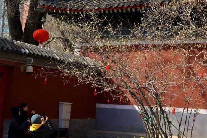 蜡梅树与红墙黛瓦、古建廊柱相映成趣,古朴雅致,成为市民早春寻香、休闲观景的好去处。