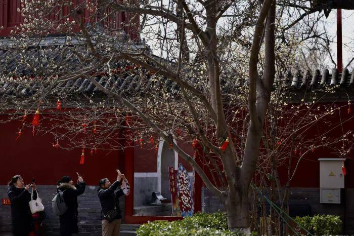 游客们在古韵建筑与清雅花香中,感受京城独有的春日序曲。