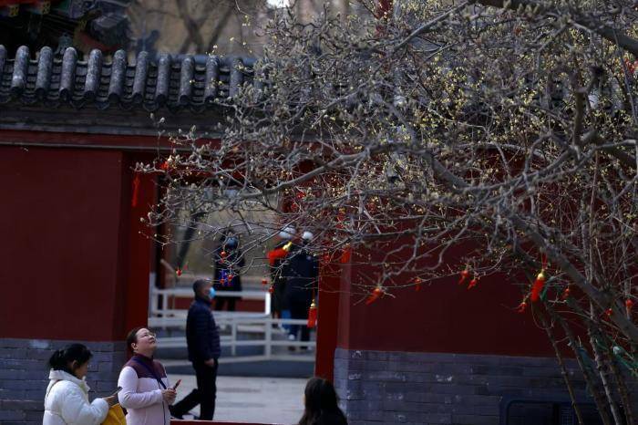 2月22日,游客在万寿寺内观赏含苞待放的腊梅。