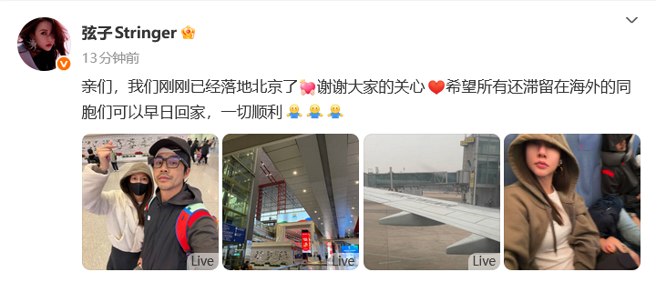 3月4日,歌手弦子发文:亲们,我们刚刚已经落地北京了,谢谢大家的关心,希望所有还滞留在海外的同胞们可以早日回家,一切顺利。