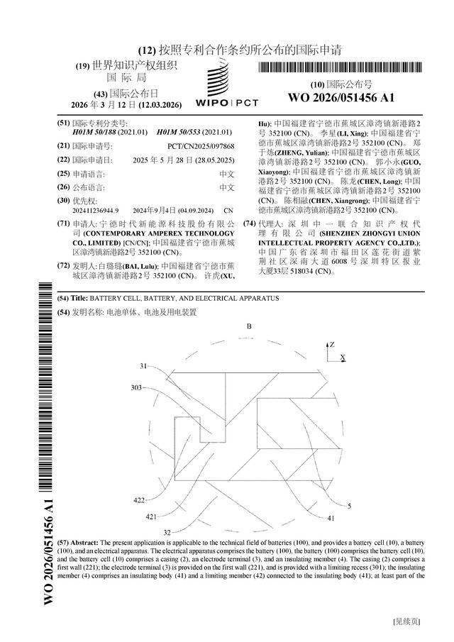 证券之星消息,根据企查查数据显示宁德时代(300750)公布了一项国际专利申请,专利名为“电池单体、电池及用电装置”低息配资平台,专利申请号为PCT/CN2025/097868,国际公布日为2026年3月12日。