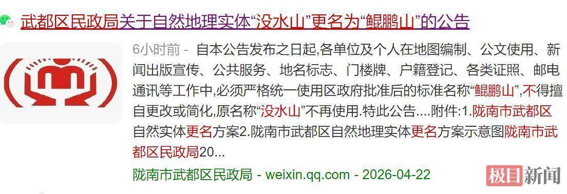 甘肃陇南武都区民政局发布公告称,该区的“没水山”已更名为“鲲鹏山”。4月22日下午,极目新闻记者注意到,武都区民政局官微已删除这则公告。