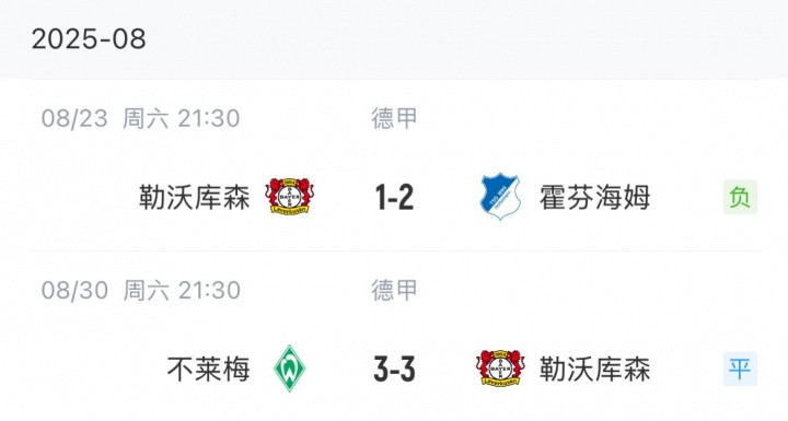 滕哈赫本赛季率领勒沃库森德甲开赛两轮不胜,只拿到1分。