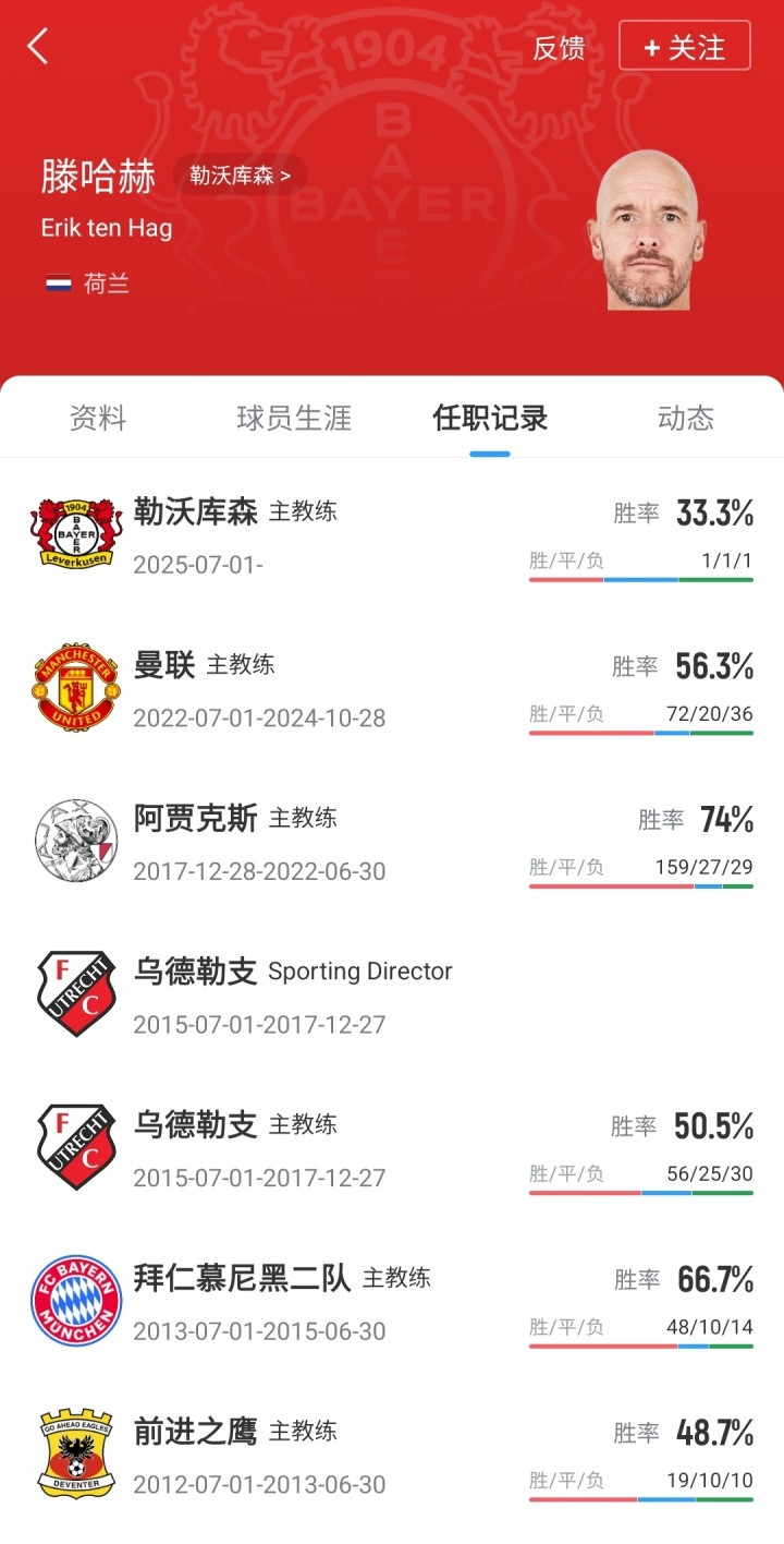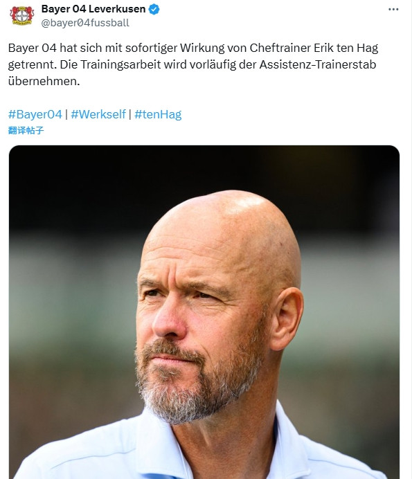 勒沃库森官方:即日起解除埃里克-滕哈赫主教练职务,训练工作暂由助理教练团队接管。